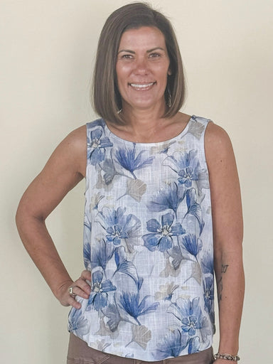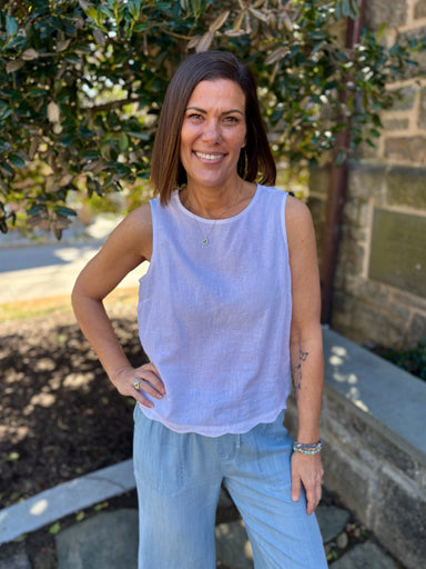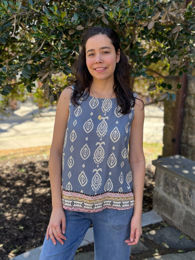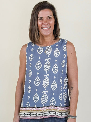 Stand out effortlessly with this sleeveless top featuring a captivating print. The breathable linen-blend fabric will keep you comfortable and cool...