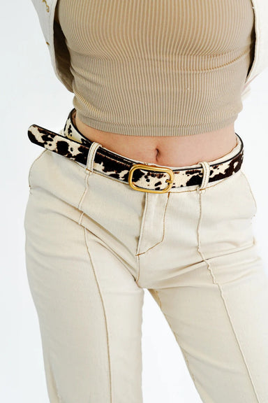 Made from genuine leather and calf hair, this belt combines texture and a bold pattern. The cow print adds a touch of ruggedness, while the rectang...