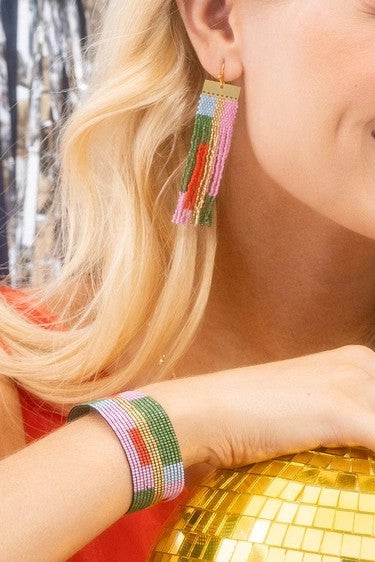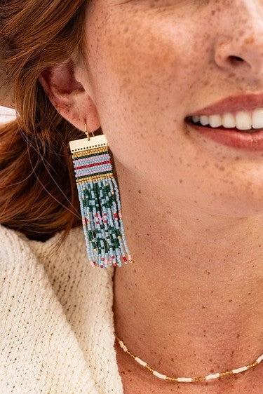 Introduce a touch of bohemian elegance to your style with the McKenzie Earrings in a captivating colorblock design. Featuring a sleek brass bar han...