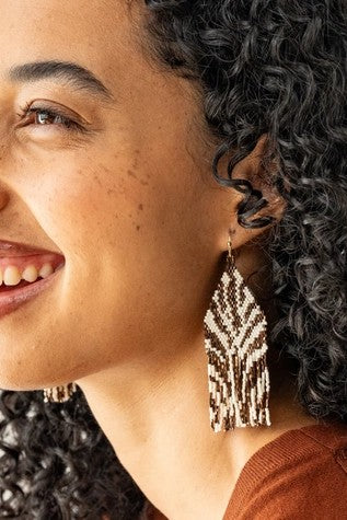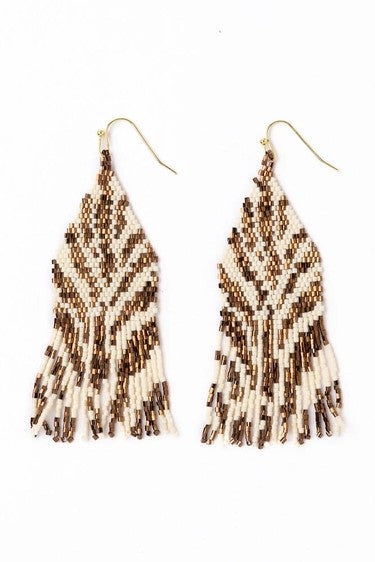 Reintroducing the Delilah Earrings, now with a bold pattern resemblant of zebra or tiger stripes. Glass seed beads in bronze and ivory and fringe d...