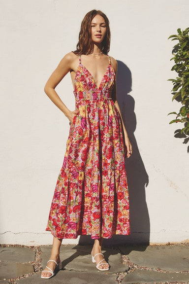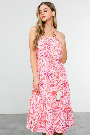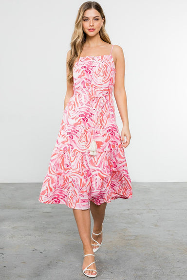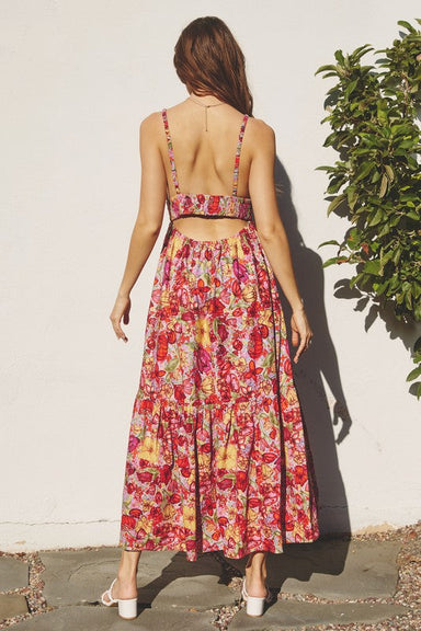 Step out in style with the Tiana Dress, designed to captivate. This daring piece features a split neckline with adjustable ties and energetic ruffl...