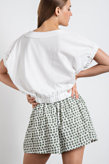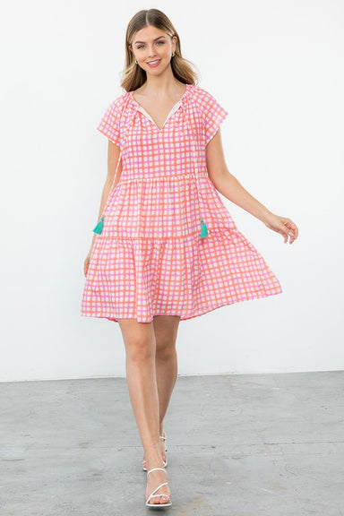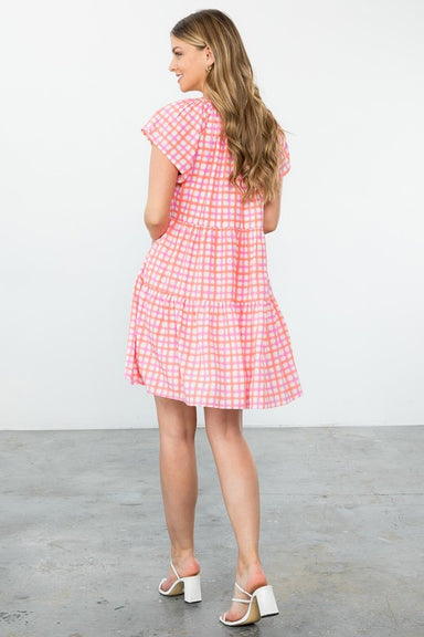 This playful mini dress features a charming ruffled v-neckline and short sleeves, perfect for layering into your fall wardrobe. The button-front de...