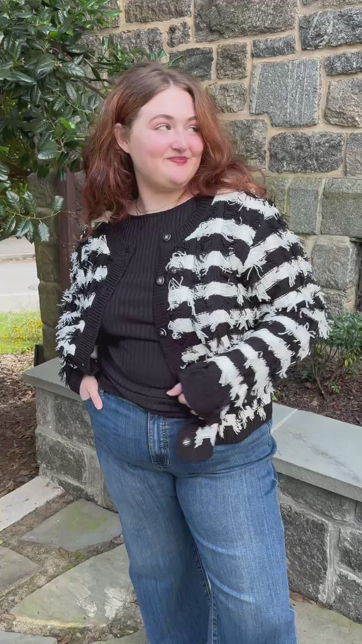 A versatile sweater with modern edge—this cardigan features a button-up front, ribbed edges, and a black and white striped pattern. The textured knit is enhanced by the fringe detailing throughout, making it a bold, captivating style.