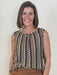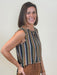 This sleeveless A-line silhouette is finished with soft shirring at the neckline that creates a graceful drape from every angle. The keyhole opening at the back adds a subtle touch of sophistication. Designed in a refined striped pattern that feels modern and elevated.