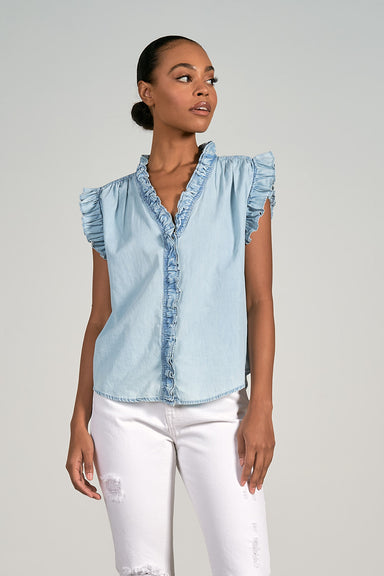 This top is a classic button-front style with a fun touch, featuring a collar and curved shirt-tail hem. The long sleeves with scrunched detailing ...