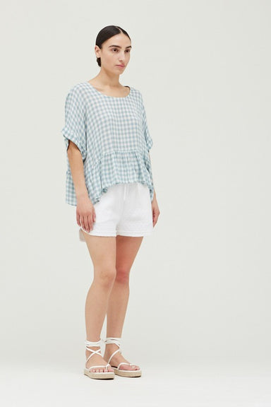 Dive into a world of dimensional style with the Katie Top. Designed in black and white, its eye-catching fringe texture in a windowpane plaid creat...