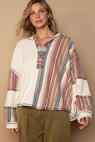 Elevate your everyday style with this sweater, made with a colorblock pattern and textured knit. The button front allows for versatility in styling...