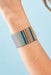 Introducing the Penelope Bracelet, a vibrant display of multicolored vertical stripes. Including lilac, green, and lemon-colored seed beads, this wide bracelet is an accessory that is sure to add a pop of color to any ensemble.
