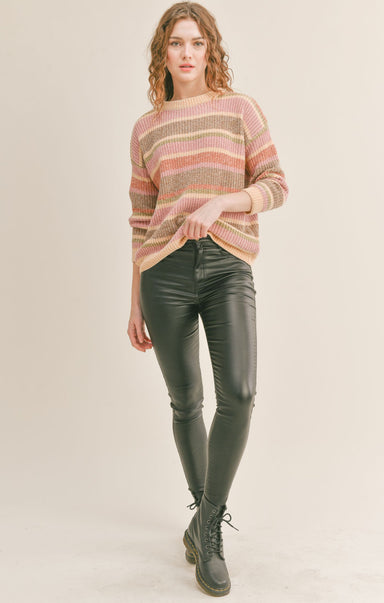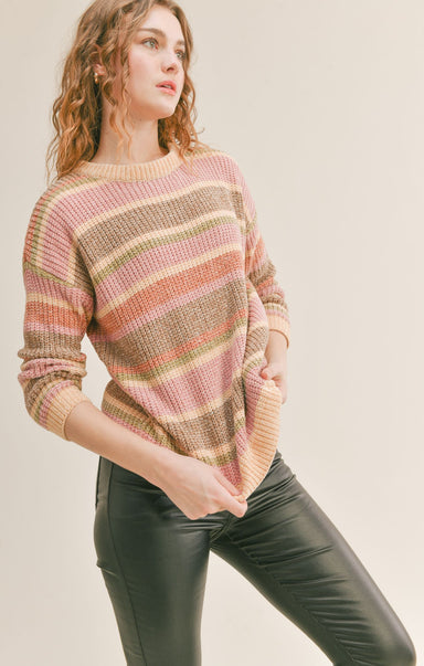 Not only does this sweater have a multicolor striped pattern, it also features allover cable knit design. With a collared v-neckline and slightly c...