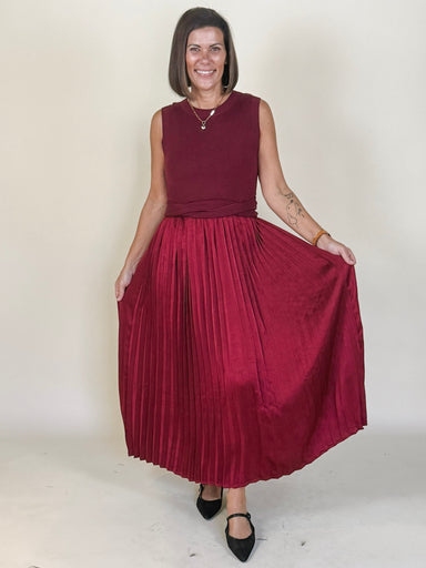 Your new favorite holiday style! This mixed media dress features a knit bodice atop a satin-like skirt. The ribbed top, pleated bottom, and twist-d...