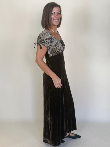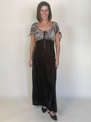The Georgina Dress merges sophistication and edge with its combination of velvet and animal print. Its puff sleeves and ribbon details add delicate...