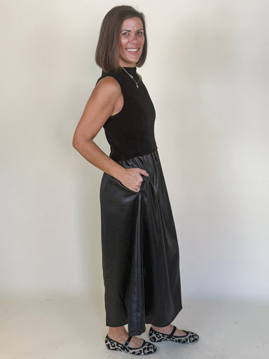 A new favorite dress for holiday styling and beyond! This mixed media dress features a soft knit bodice atop a satin-like skirt, adding eye-catchin...