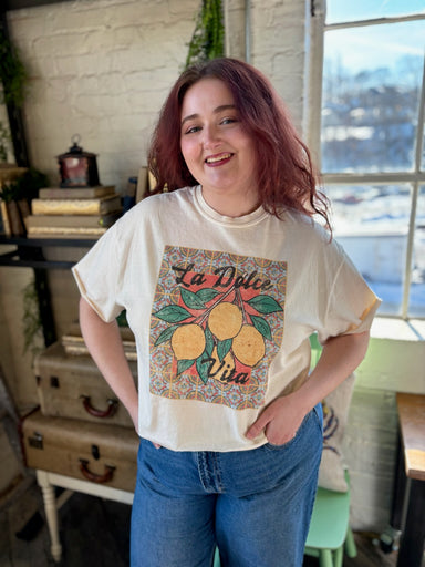 Graphic tees are a wardrobe essential, especially for warm-weather styling. This cropped crewneck featuring a brightly-colored vintage graphic of t...