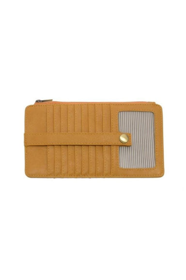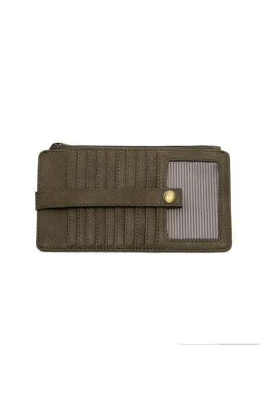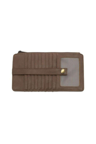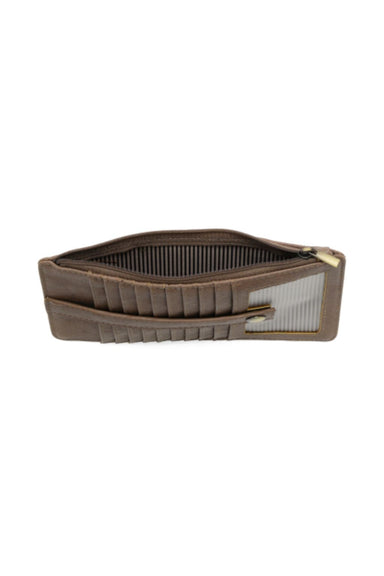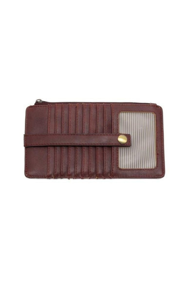 This slim and sleek card wallet has a zippered change pocket, zippered billfold pocket, ID window, and 9 credit card pockets all in casual distress...