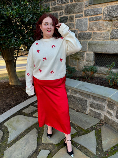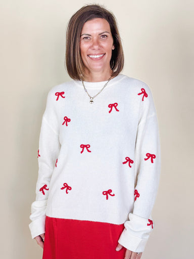This adorable sweater is perfect for holiday styling with its warm white color and bright red ribbon embroidery throughout. Pair with a skirt for a...