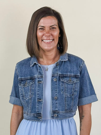 Get that cool and sophisticated look with this cropped denim jacket. The chest pockets are practical and the rolled short sleeves and cropped lengt...