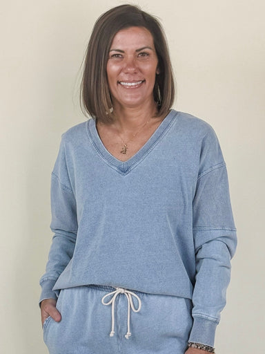 Soft knit denim gives this v-neck sweatshirt its laid-back edge. The mineral wash adds a perfectly lived-in look that only gets better with wear. W...