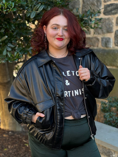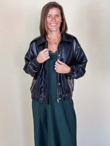 This faux leather bomber channels a classic vibe while still feeling modern and wearable. With its collared neckline, zip front, and flap pockets, ...