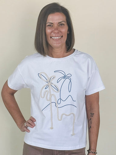 Comfort meets style with this graphic t-shirt featuring both printed and soutache details. The palm tree design makes this tee perfect for spring b...