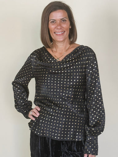 Step out in style this holiday season with the Blair Blouse. Made from satin-like fabric that flows with you, it features a cowl neckline, bubble s...