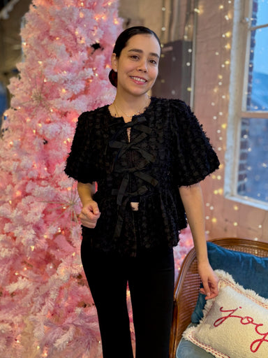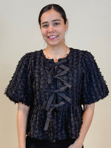 Not your average peplum top, this style is covered in fringe for a textured feel and unique look. Its front tie details and puff sleeves add a cute...