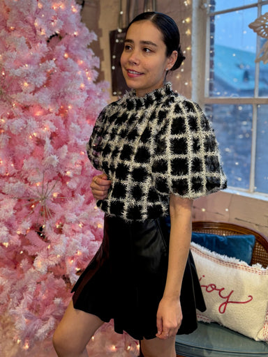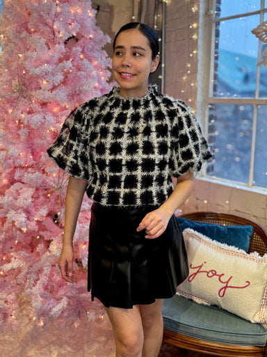 Dive into a world of dimensional style with the Katie Top. Designed in black and white, its eye-catching fringe texture in a windowpane plaid creat...