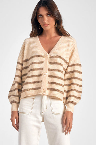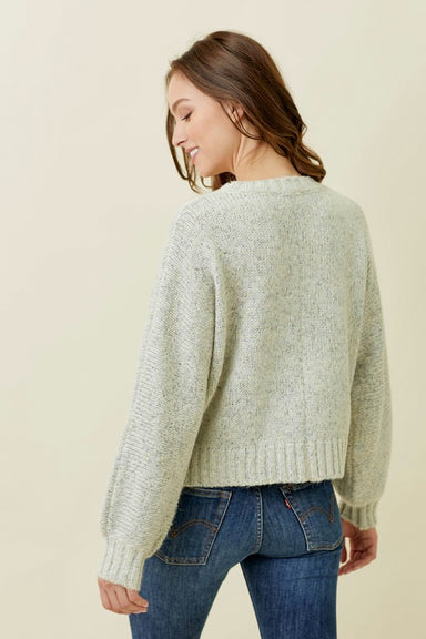 This cardigan is a unique sweater that combines a chunky knit, multicolor flecks, and sequins throughout. Featuring a v-neckline, bubble sleeves, b...