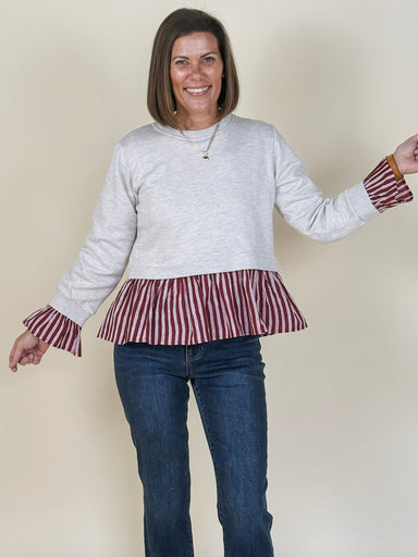 Create a comfortable, polished look with this mixed media top. The mostly solid-colored design gives the top a casual feel while the striped peplum...