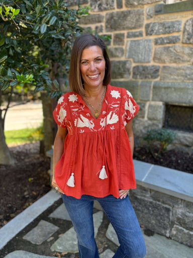 Add a playful charm to your wardrobe with the Nora Top. Featuring a flirty split neck with tassel ties and chest embroidery, this top combines swee...