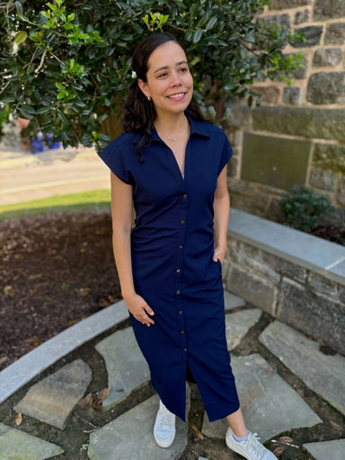 This dress combines elegance and comfort, featuring a chic collared v-neckline and cap sleeves. The button front and practical pockets add both sty...