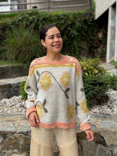 The bright Sara Sweater brings cheer to your wardrobe with its playful fruit patterns and eye-catching colorblock design. Featuring an oversized fi...
