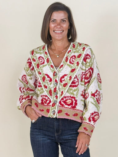 Capture timeless style with the Bria Berber Sweater. Its v-neck and charming balloon sleeves create a classic silhouette, while metal front buttons...