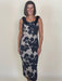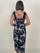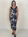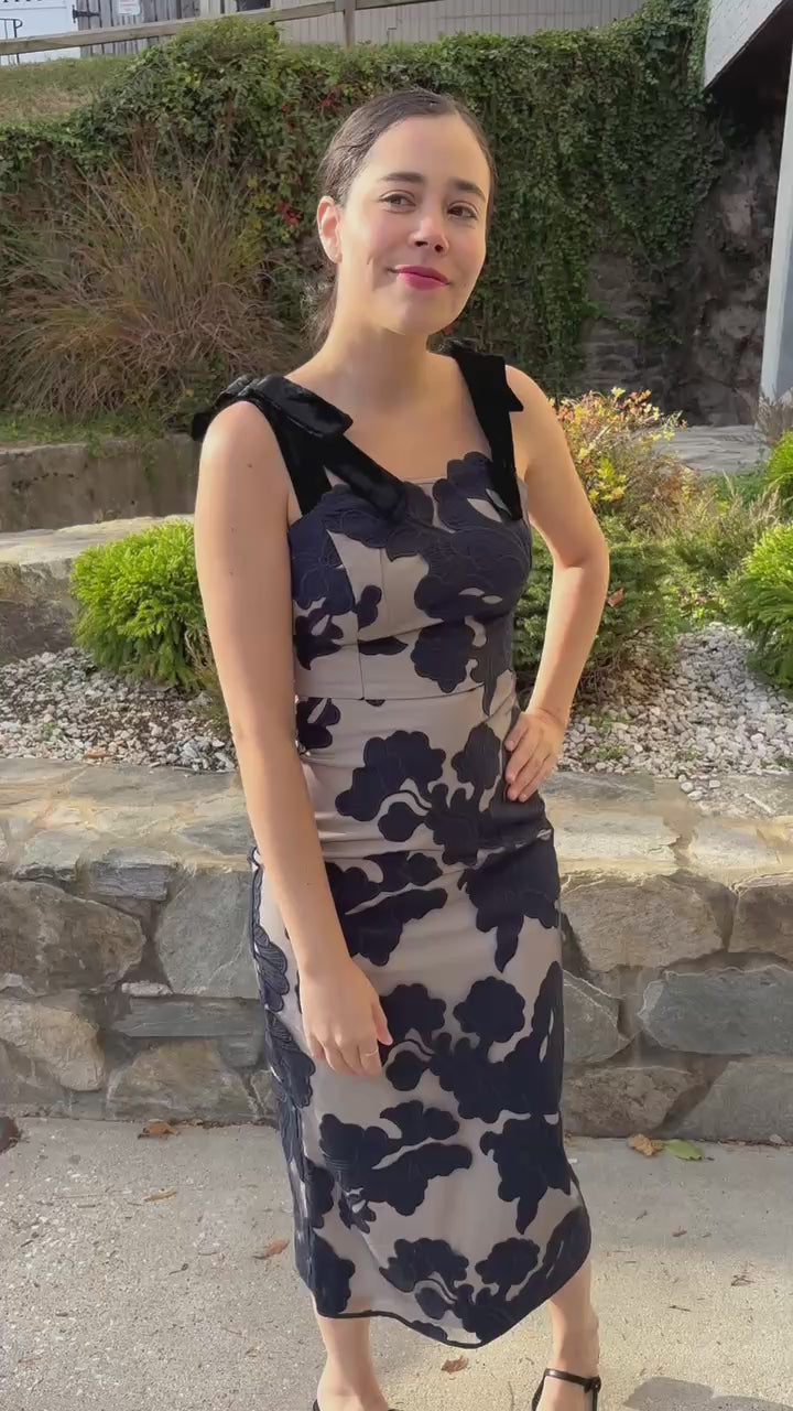 Introducing the Juniper Dress, featuring a nude base fabric overlaid with a sheer mesh adorned with large floral embroidery in navy. The pencil-style silhouette with a midi length, romantic embroidery, and velvet details create a sophisticated style that is perfect for cocktail parties, galas, and formal dinners.