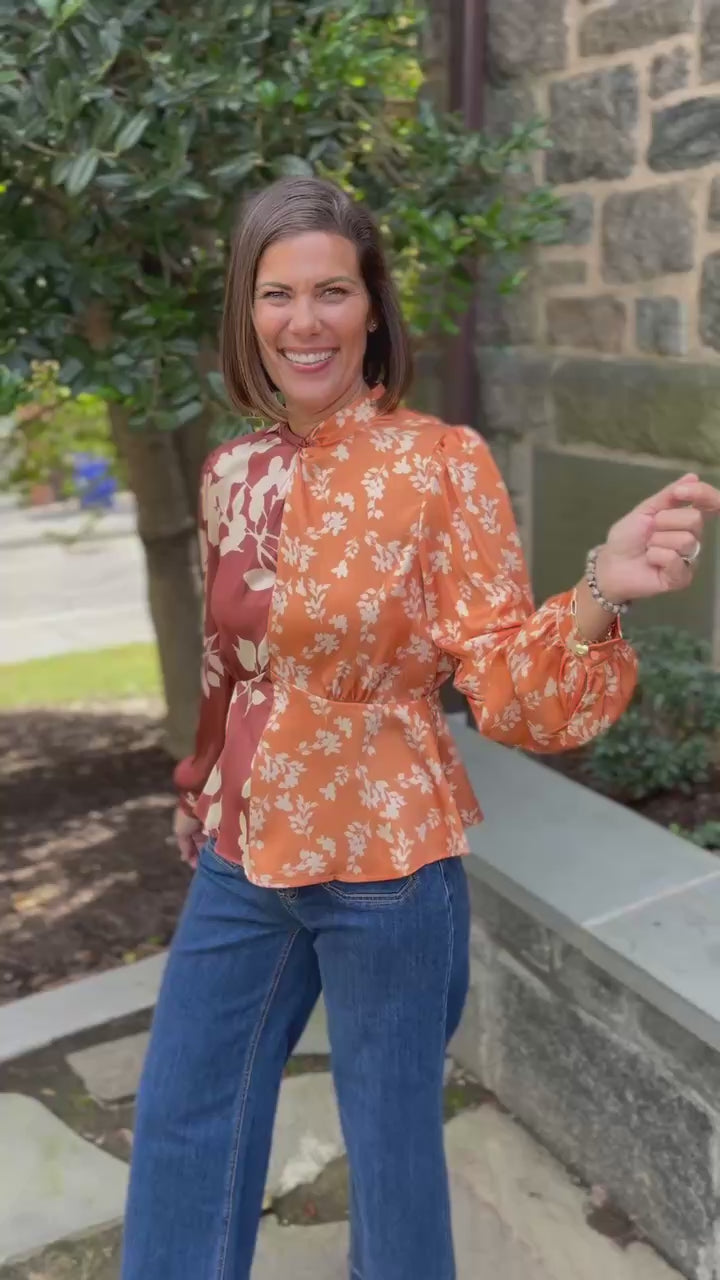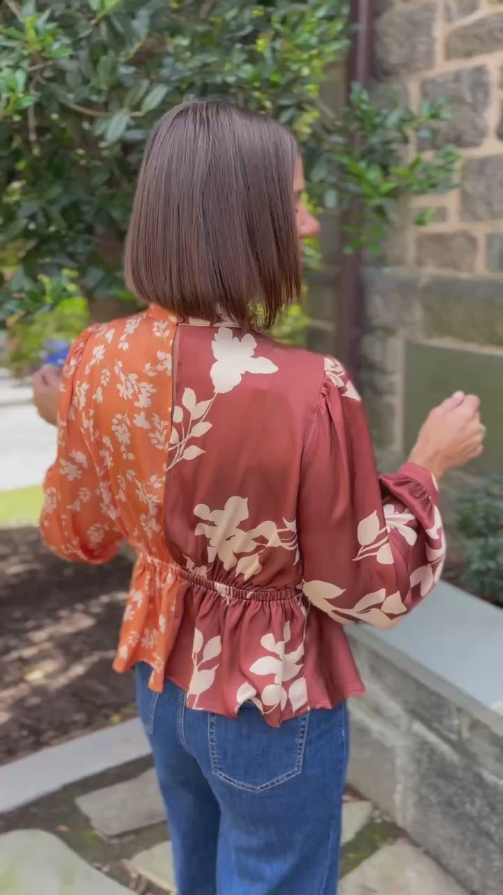 This sophisticated long-sleeve blouse makes a striking statement with its chic design. The twist-detailed mock neck and peplum hem help create a modern and flattering silhouette. Designed with an overall relaxed fit, it offers both comfort and modern elegance. Pair with trousers or a skirt and heels for a refined ensemble perfect for dinner dates or cocktail gatherings. This top's lovely two-toned design with contrasting florals is also available as a midi dress.