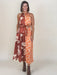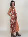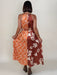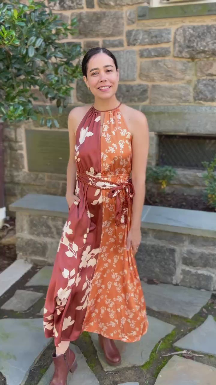 This sophisticated midi dress features a chic halter neckline, beautifully complemented by an eye-catching design. The sleeveless cut and tie waist help create a modern and flattering silhouette. A great choice for events like graduations, luncheons, or garden parties. The dress's lovely two-toned design with contrasting florals is also available as a blouse.