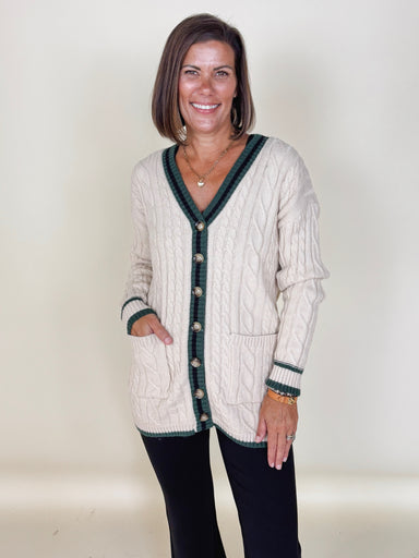 The Basel Cardi is a flattering, longline cardigan. It features a cable knit design and contrast edges, as well as a button front for versatility i...