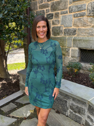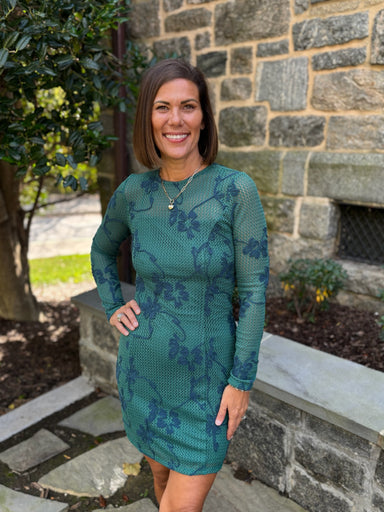 Introducing the Juniper Dress, featuring a nude base fabric overlaid with a sheer mesh adorned with large floral embroidery in navy. The pencil-sty...