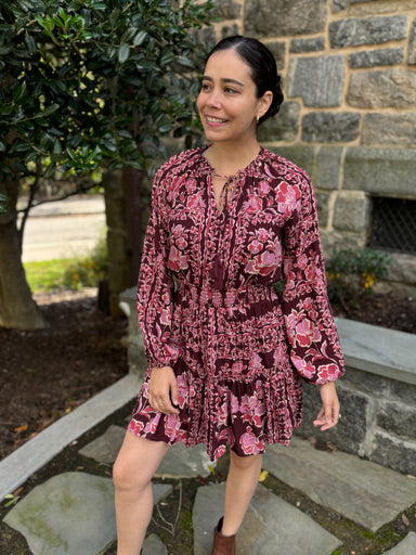 This delightful mini dress, in a rich and eye-catching floral print, is designed for both comfort and standout style. The smocked waist gracefully ...