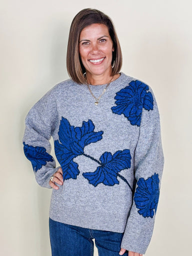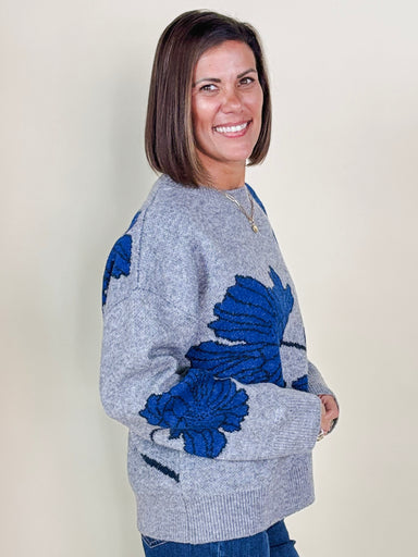 This delightful knit sweater features a vibrant intarsia floral design, beautifully rendered in sapphire tones against a classic grey background. C...