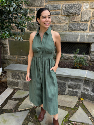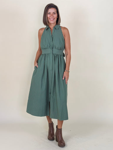 This dress features a chic halter neckline with a crisp collar, lending a unique and stylish touch. The button-down front adds versatility, while t...