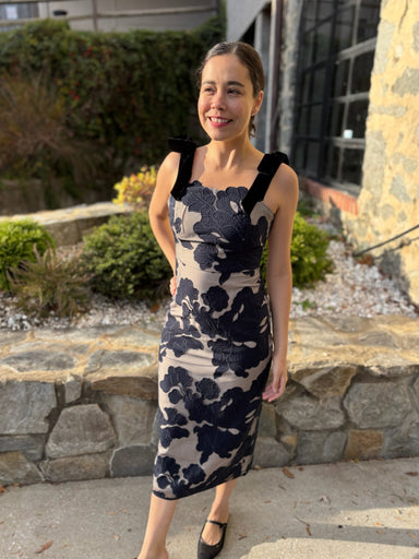 Introducing the Juniper Dress, featuring a nude base fabric overlaid with a sheer mesh adorned with large floral embroidery in navy. The pencil-sty...