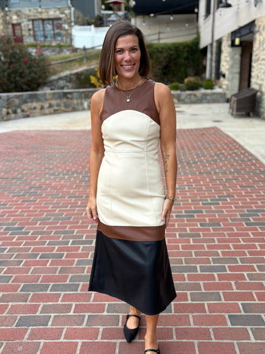 Both elegant and bold, the Caspia Dress is crafted with faux leather in a colorblock pattern and features a high neck, cinched waist, and A-line sk...