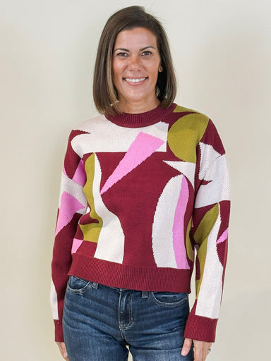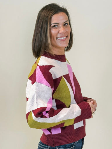This sweater's vivid abstract pattern gives it a retro feel that is sure to capture attention and brighten up your wardrobe. The mock neck, drop sh...