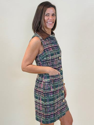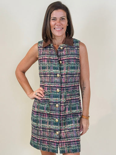 Capture timeless elegance with this dress. Its vintage-inspired design features a collar, button front, and sleeveless silhouette and classic tweed...