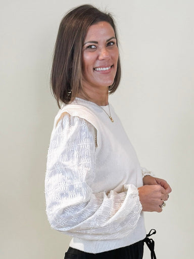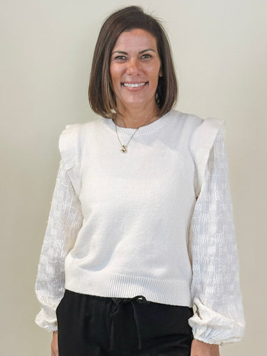 This sweater is the perfect style for transitioning from winter to spring. With a sweater-knit bodice and woven balloon sleeves featuring a texture...