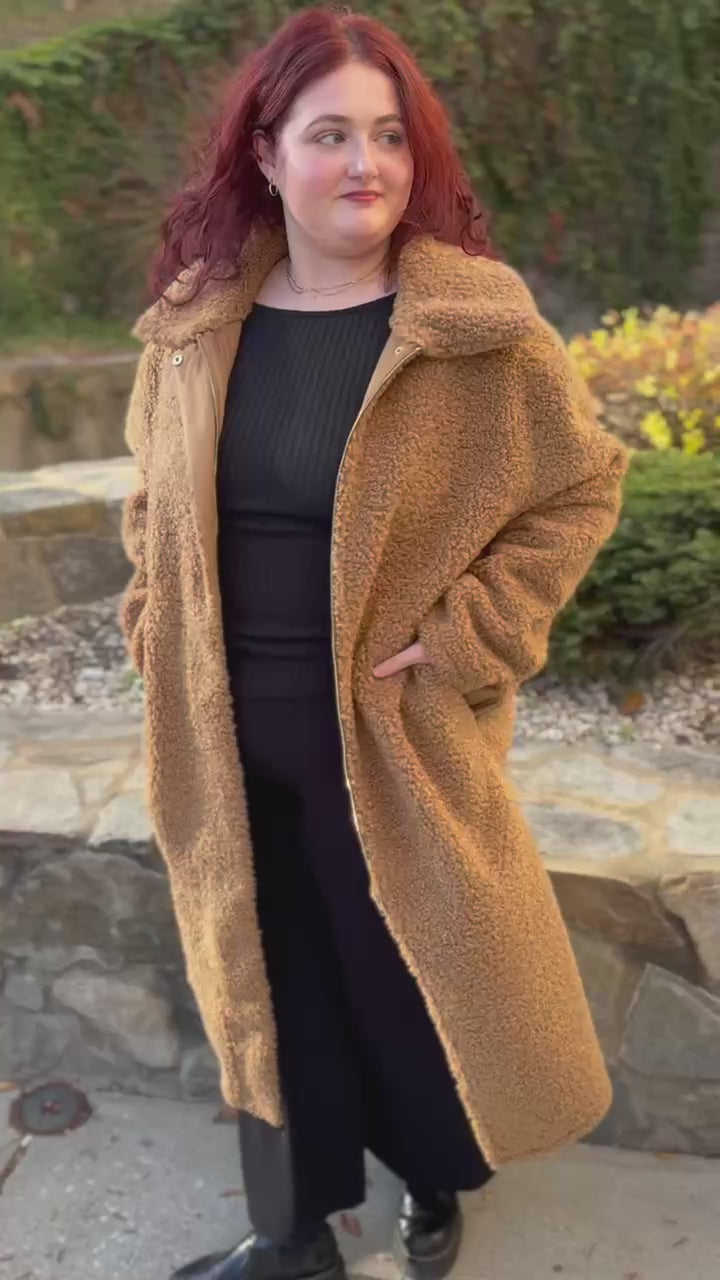 Soft sherpa outside gives this zip-front coat its cozy, plush feel, while faux suede lining keeps the look elevated. An adjustable interior drawcord lets you cinch the waist or leave it relaxed for layering. Side pockets and a snap placket provide added function.