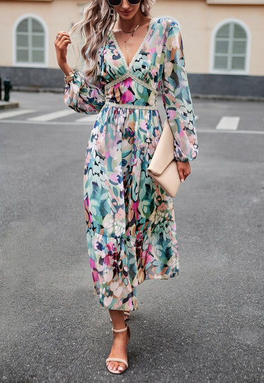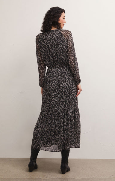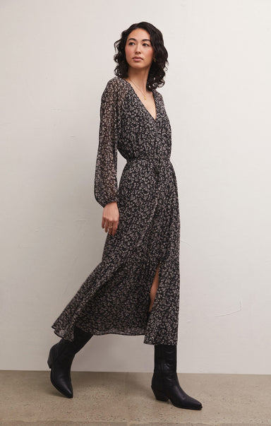 This crepe dress features feminine florals and a sleek boat neckline. Its long, slightly flared sleeves and mini length create a modern look. The C...