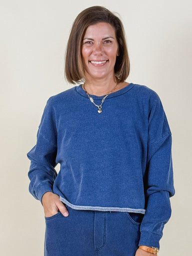 Crafted from knit denim french terry with a lived-in mineral wash, this relaxed crewneck has that just-right slouch and raw edge detailing. Perfect...