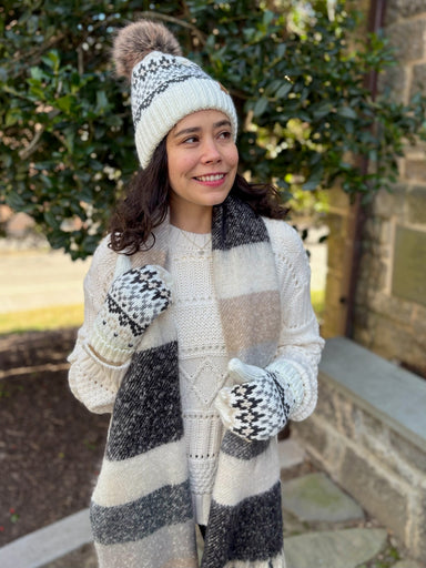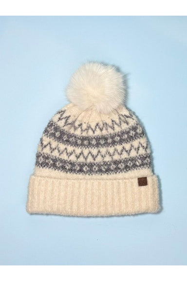 A classic cold-weather accessory, this cozy hat in an ivory, gray, and tan winter pattern features a faux fur pom and fleece lining. Pair with the ...
