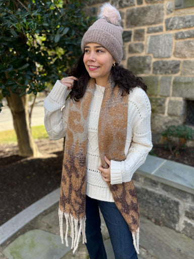 Add a bold statement to your outfit with this leopard print scarf finished with playful pom pom tassels. Designed for comfort and style, this versa...
